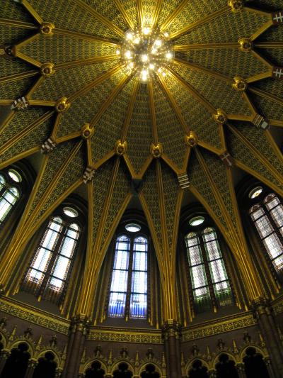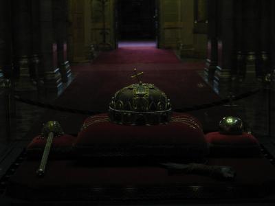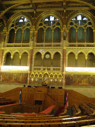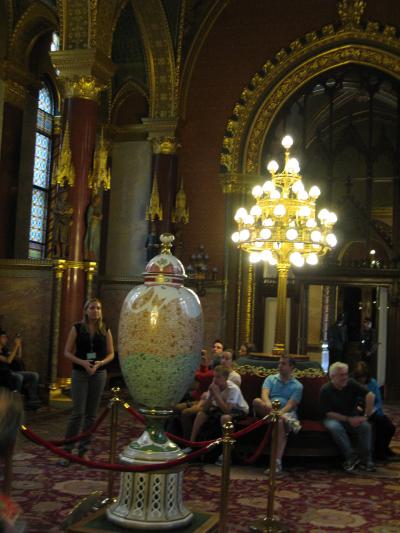予約時間になれば建物内に通してくれ、バウチャーチェック (パスポートの提示も必要) と荷物検査を済ませた後、係員の案内で、?メインホール ?王冠 ?待合室のような部屋 ?議場 ?廊下 の順に見学し、元の入口に戻ってきて解散です。(約45分)
