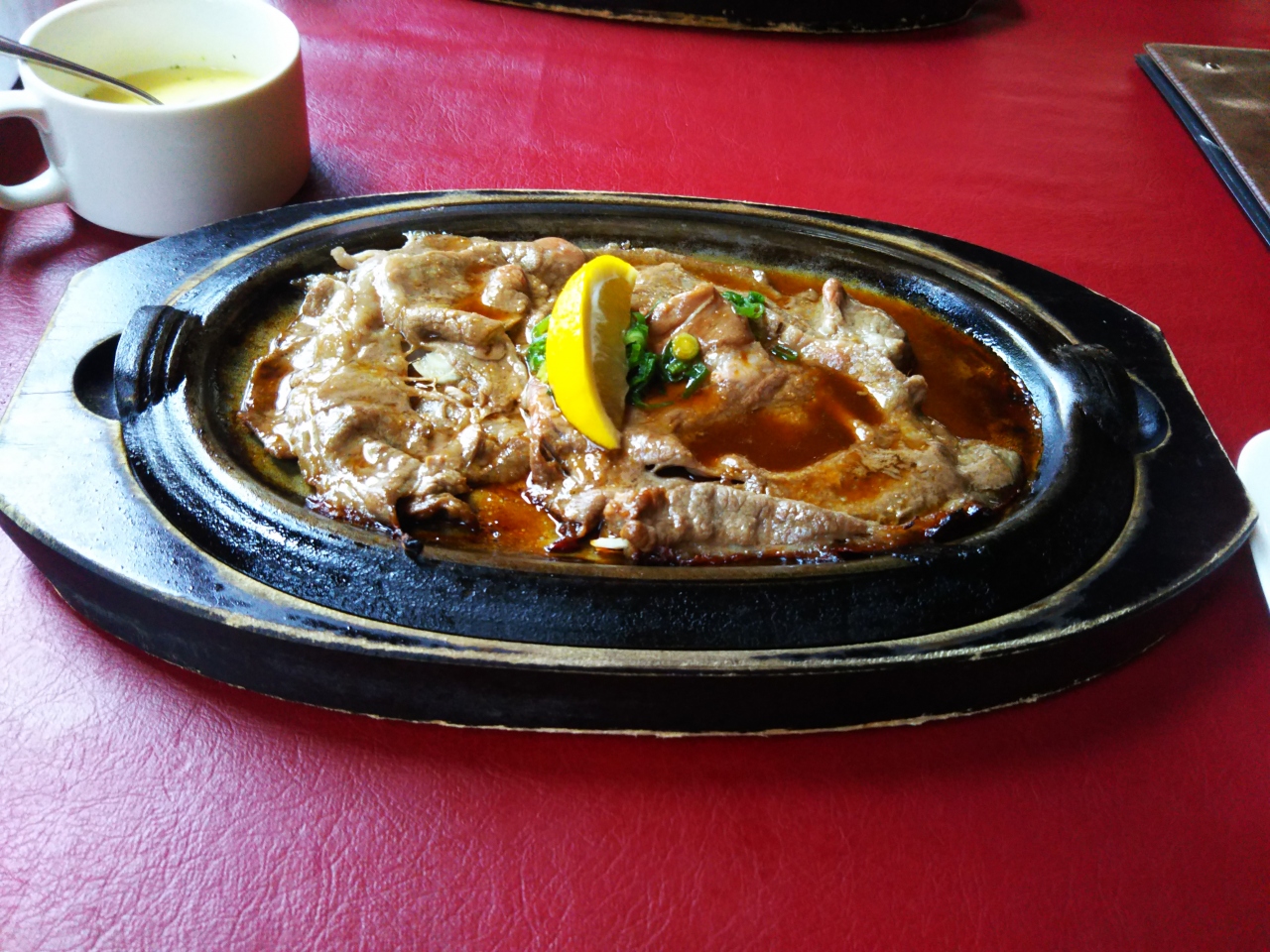 名物のレモンステーキが有名なお店です。娘が昨年、友人達と行ったら凄い行列で入れなかったと嘆いてたので、開店の11時前に並びました。 2番目でした。 お肉は大きな薄切りで柔かく、お醤油ベースか?たれが美味しくてご飯がすすみます。