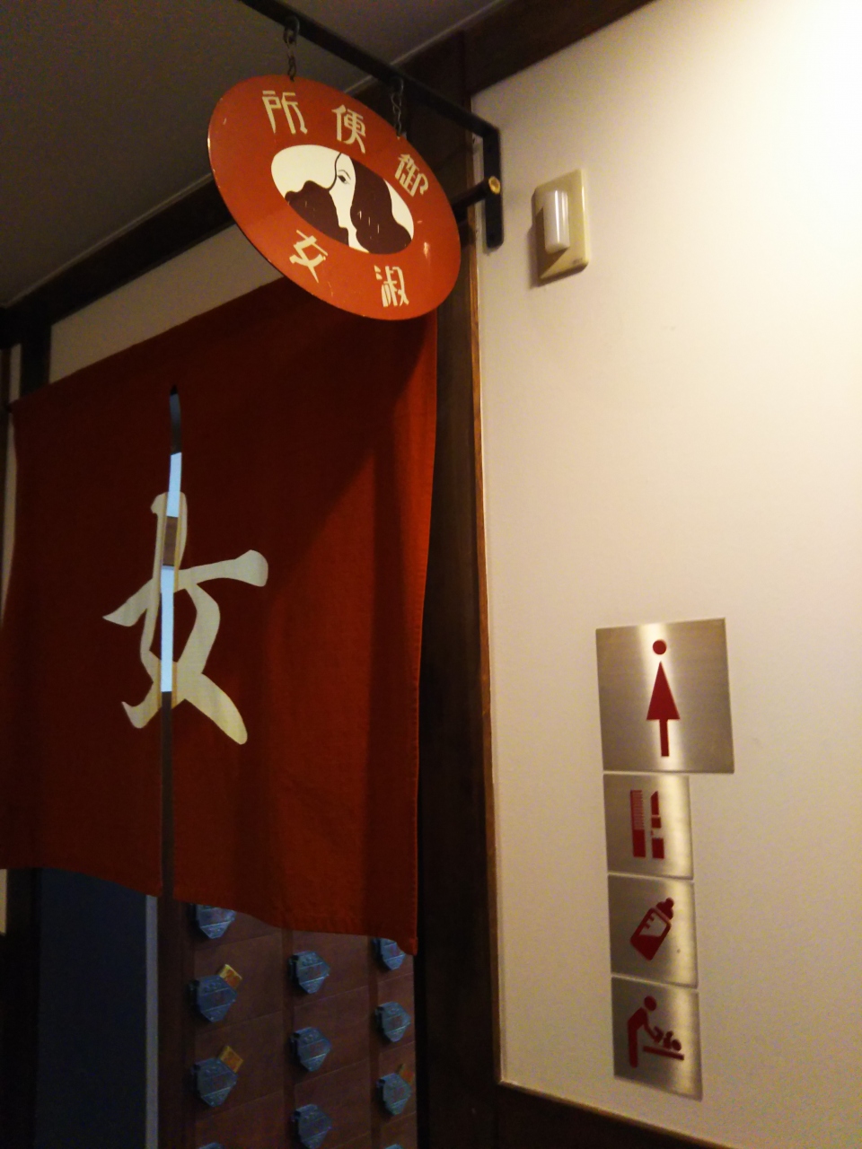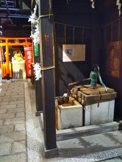昭和の長屋を再現し、大阪の美味しい飲食店が集まってます。 お好み焼き、串、焼き肉と手頃な値段でいただけます。 トイレは入口はいってびっくり。 下駄箱、靴脱ぐの?と一瞬戸惑います。脱がなくていいんです。 銭湯風の設えでした。