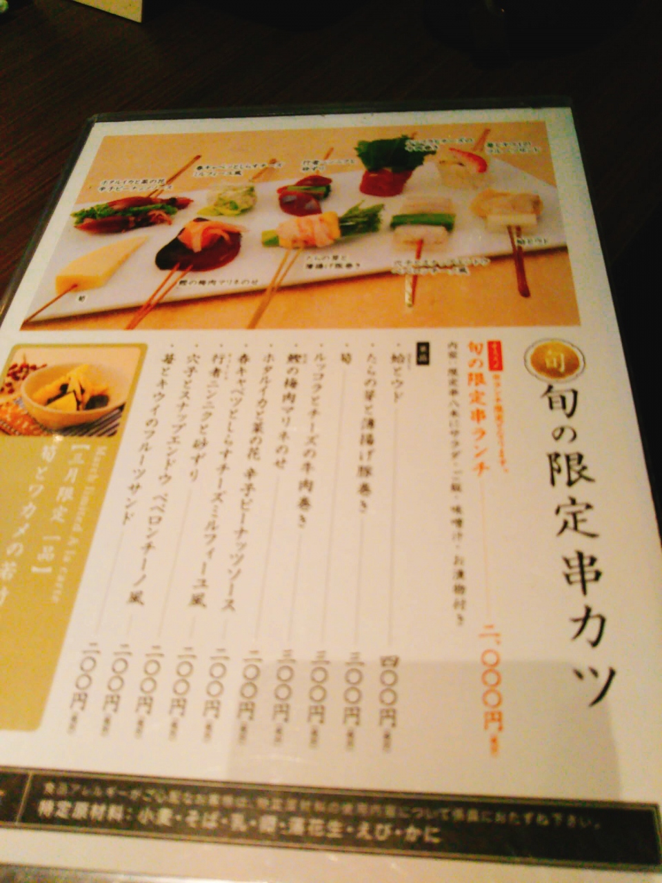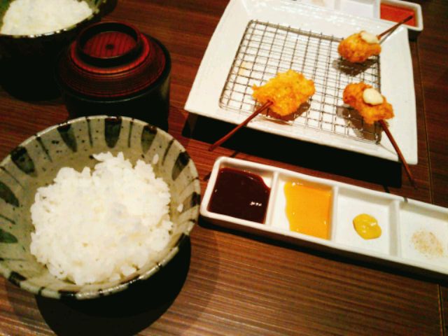 美味しい串が お手頃な値段でいただけます。 コース(ご飯・味噌汁・デザート付)に好きな物を追加して注文します。 海老もきすも素材良く、衣はふわふわでしつこくなく胃もたれしない。 ご飯のお代わりもOK。買い物の合間に手軽に美味しくいただけます。 ワインも種類多く置かれています。 デザートのアイスも美味です。