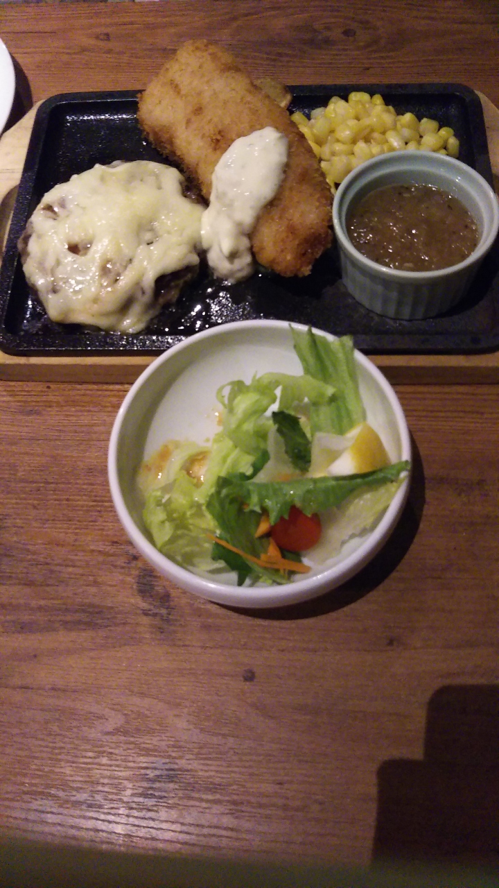 夢舞台のお店。落ち着いた雰囲気で席と席の間もゆったりしていて落ち着きました。ハンバーグはソースが選べます。 てごねで注文聞いてから作りますと説明ありました。