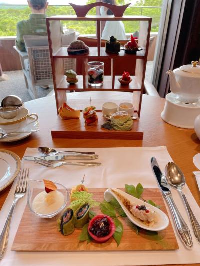 志摩観光ホテルクラシックの緑の庭に面した素敵な席でアフタヌーンティがいただけます。スタンドではなく 入れものは、三重県の木材が使われています。材料も地産地消を心がけておられます。一品一品 手が込んでいてボリュームあります。和菓子もあり大満足です。