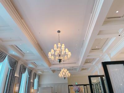 天井が高く 外からの陽光が優雅なレースカーテン越しにはいり、照明も素敵です。