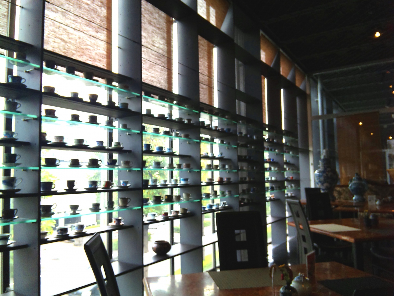 開放感あふれるウインドーには、ハンパないくらい数多くの有田焼のコーヒーカップのデイスプレー。ディスプレーだけかなと思ったら、その中からお気に入りのカップをオーダーの時に選ぶと、食後のコーヒーはそのカップに注がれてでてきます。