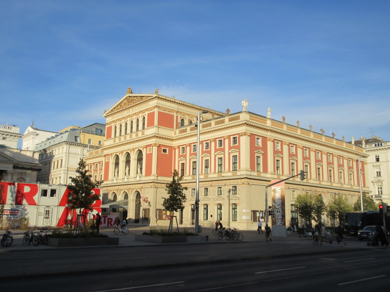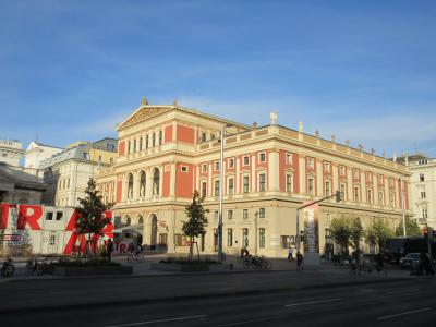 【ウィーン学友協会】はニューイヤーコンサートでテレビを通じて何回か見たことがあったのですが、今回はウィーン滞在の際に時間もあったので足を伸ばしてみました。ロケーションはウィーン滞在の際にカールスプラッツの駅を降りてすぐ。ただ、想像したよりも小ぶりな建物で、大学の講堂とあまり変わらない佇まいでした。ウィーンのオペラハウスのような石のどっしりとした外観ではなく、正面ファサードは一層から三層までロマネスク建築を思わせるラウンドアーチを使っていて、さらに壁の色も茶色と白をベースにしているため、やさしい雰囲気が感じられました。