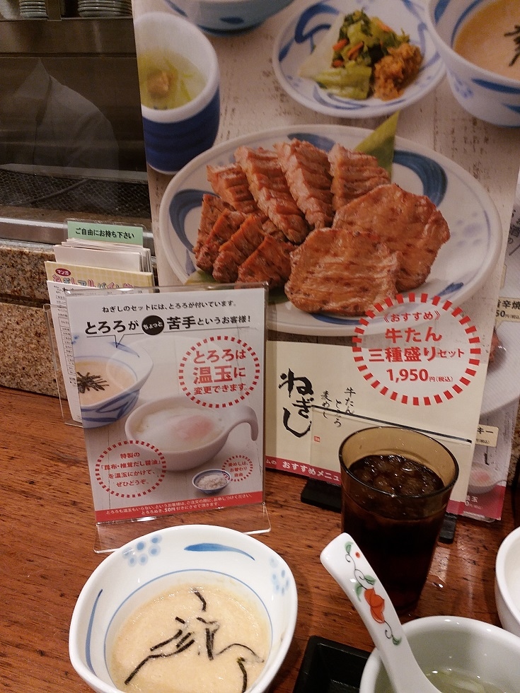 丸一日人込みでもまれ、東京での宿泊先に近い神田駅前で、空腹を満たすべく入ったのが、こちらの【ねぎし神田駅前店】です。ブラッキーセットも良いのですが、この日は牛たん三種盛りセットをオーダー。お肉は厚くて、ボリュームがありますし、ごはんも御替わりが出来て大満足でした。とろろが苦手という方は、とろろ抜きにしてもらうことも可能です。