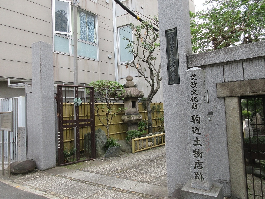 本駒込駅を降りてすぐ、本郷通り沿いに「土物」という聞きなれない言葉が刻まれた石碑がありました。【駒込土物店】は、大根や人参といった、土のついた野菜(土物というそうです)が取り引きされていた場所とのことで、江戸時代の町の様子を今に伝える石碑でした。当然、今はそうした市場はここにはないのですが、当時のにぎわいを想像することが出来ました。