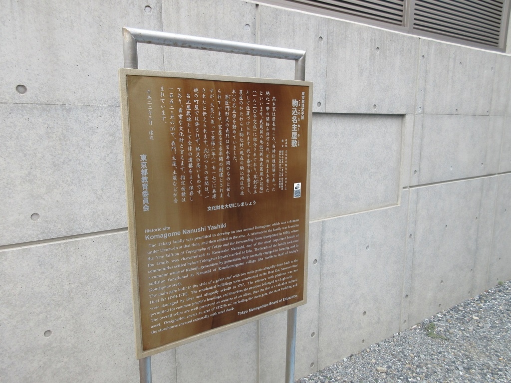 駒込界隈を散策し、住宅街の中を探し回って漸くたどり着きました。とにかく分かりにくい場所にある名主屋敷で、苦労してたどり着いたにも関わらず、中には入れずに外観のみの見学でした。駒込で江戸時代に名主を務めた高木家のお屋敷とのことで、今でも人が住んでいるということで、見学も難しいというのも致し方ないかと思いました。木がうっそうと生い茂り、手入れが行き届いているようには見えないのが少し残念でした。