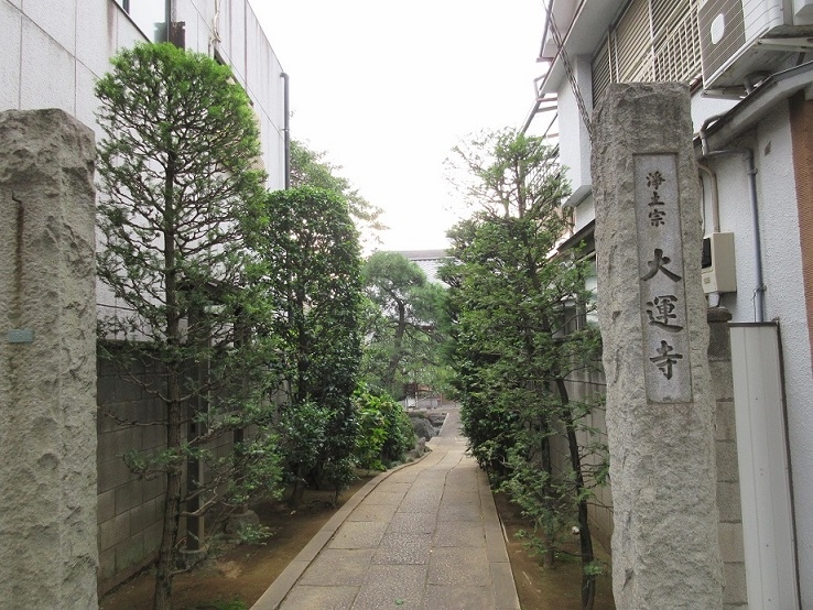 本駒込駅界隈のお寺巡りをした際に、本郷通り沿いにあるこちらの大運寺にも立ち寄りました。両側に木が植えられた石畳みの細長く続く参道をすすむと、小さな本堂が建っていました。ただ、田舎町にある公民館や集会所のような建物で、あまりお寺らしい佇まいではありませんでした。