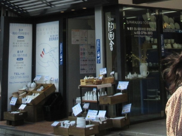 地下鉄の明治神宮前駅からほど近い場所にある、国産の陶器を中心としたお店です。絵付けの教室の案内のポスターも貼ってあり、豊かな趣味の世界を垣間見ることが出来ました。絵付けの道具や、絵付けにもうってつけなのでしょう、白い陶磁器の販売も行っていました。