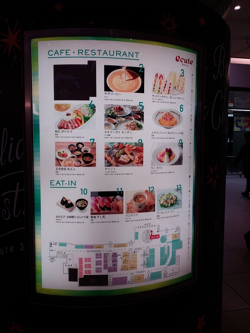 関東の品川駅などにもある「エキナカ」商業施設が、JR線大宮駅の改札内にもありました。和食のお店や寿司屋さん、タイ料理、おむすびやなどまであり、充実ぶりに目を見張りました。大宮は新幹線も停まる駅で大勢の方が利用するからでしょうか、とても賑やかでした。私は都内の宿泊先に戻る前、【エキュート】施設内のパン屋さんに立ち寄ってから列車に飛び乗りました。