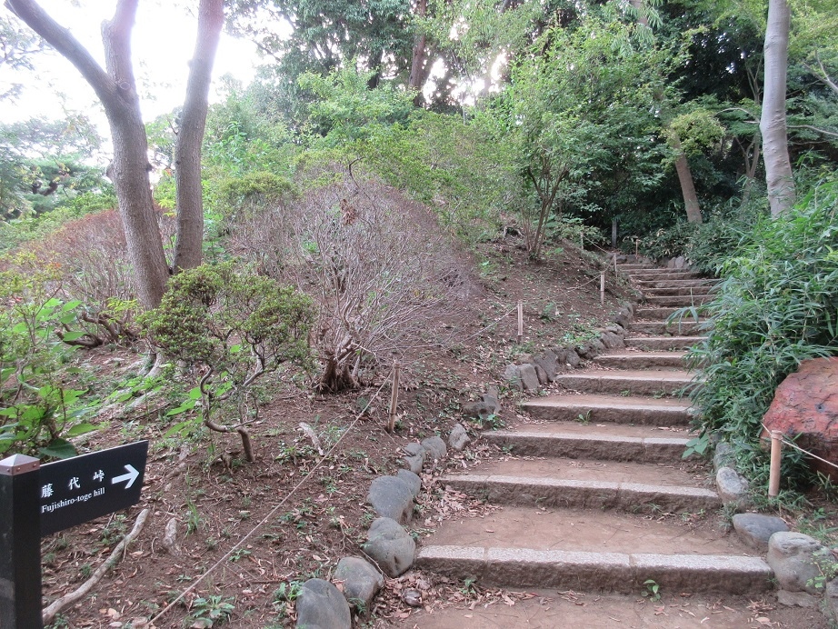 六義園を訪問、園内の一番奥にある小山が30mほどの高さのあるこちらの藤代峠です。うっそうとした木々の間を標識に従って歩いてゆくと、小川を渡った先にありました。私が訪れた時は、私以外にこの藤代峠まで足を延ばす人もおらず、どこか深い森の中を一人で散策しているような錯覚さえ覚えました。