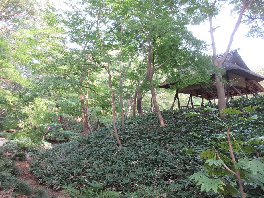 六義園の散策途中、藤代峠の手前にある東屋がこちらです。100年以上前、つつじの木を利用して造られたことから、このような名前が付けられたとのこと。趣のある峠の茶屋のような佇まいで、少し小高い場所にあることから、散策途中の目印にもなる休憩地点でした。
