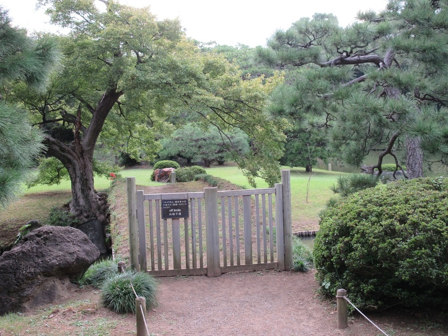 六義園の中で、大泉水の中に浮かぶ妹山・背山がある中の島に渡る橋で、若干盛り上がった形状をしていました。通行止めで、橋の手前に柵が設置されていました。橋は草がうっそうと生い茂り、その奥には木々の生い茂る中の島が見えていました。