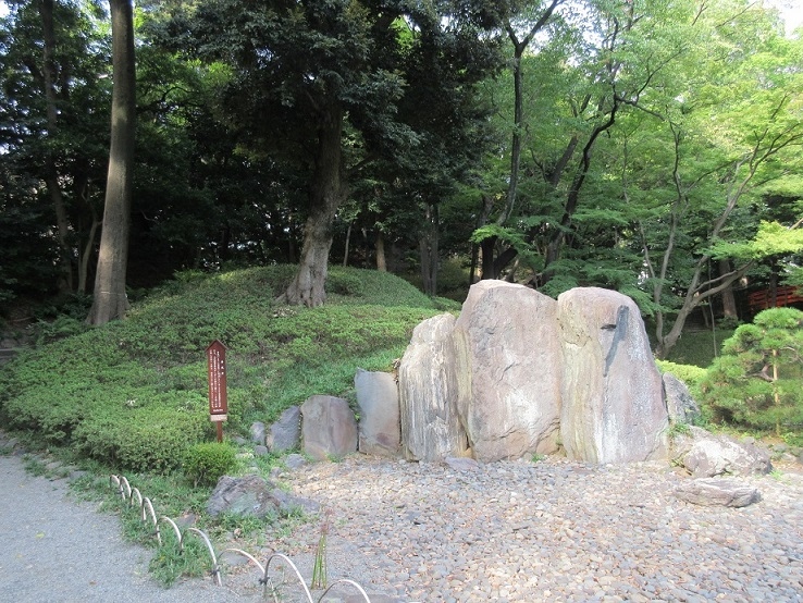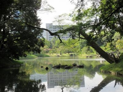 大泉池の中央に緑豊かな大きな島が浮かんでいました。不老不死の妙薬を産するとされる中国の伝説の島で、日本の文化の中でも特別な意味をもっていたのでしょう。大名達の教養の一つとして、こうした中国の文化が深く浸透していたことに想いを致しながら池を隔ててではありますが見学しました。島には岩に見立てた大きな石も置かれ、箱庭のような楽しさがありました。