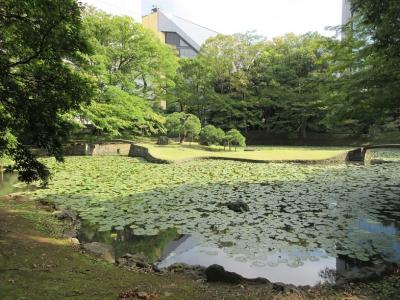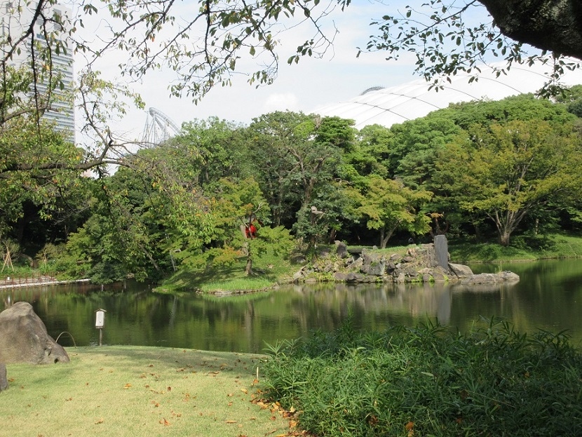広大な小石川後楽園のなかでも入口から最も奥まったところにあるのが、こちらの内庭です。私が訪れた時には大きな池に蓮が浮かび、石橋の向こうには陽射しを浴びてまばゆいばかりに輝く芝生が広がっていました。江戸時代は書院があったとのことですが、今はそうしたものは残っておらず、遠くに水道橋のドーム球場の白い屋根が姿を見せていました。