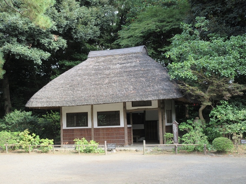 田舎の民家のような佇まいの茅葺き屋根の建物が、小石川後楽園の奥まった場所を歩いていると目に飛び込んできました。風情を感じる建物は、昔の茶屋や酒場のような使い方がされていたとのこと。緑豊かな庭園の中で、峠の茶屋に入ったような、どこか懐かしく、ほっとする雰囲気が感じられました。