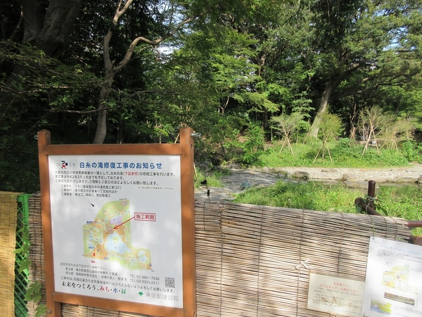 小石川後楽園の中を散策して、一つ松の先に進んでいくと、「白糸の滝修復工事」の看板が設置されていて、仮囲いもあり近づくことが出来ませんでした。丘のようになった場所なので、おそらく人口の滝を作り【白糸の滝】と呼んでいるのだろうと、想像する他ありませんでした。