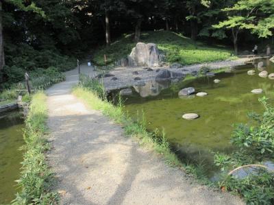 京都の嵐山にある大堰川に因んで造成されたものとのことですが、川というより沢と呼ぶ方が相応しい小さな流れでした。通天橋方面に向かって歩いていくと渡ったのですが、細長い池といった程度の水量でした。でもそれを川に見立てて、かつての大名は楽しんだのでしょう。「川」にはいくつもの石が置かれていて、それらしく見せていました。