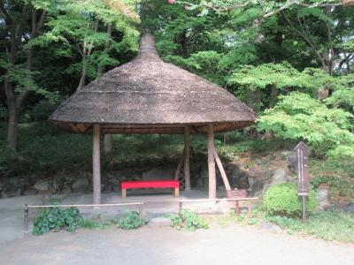 小石川後楽園の大泉水の池のほとりから少し離れた、緑の木立の間にある田舎の東屋のよう佇まいの休憩所です。茅葺屋根のした、赤い布が敷かれたベンチは、お茶を飲みながら団子を食べたらさぞかし風流だと思えるような、良い味を出していました。