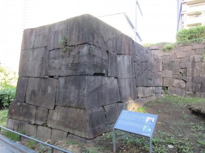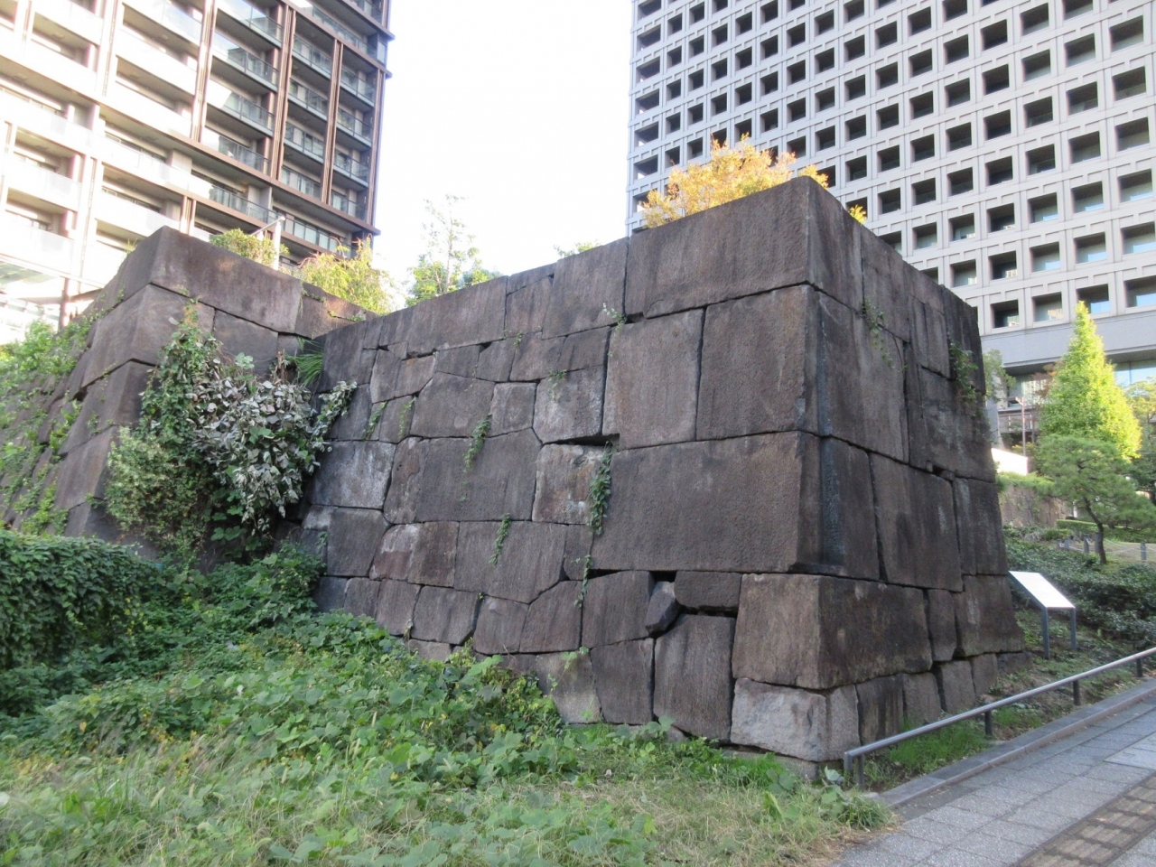 永田町駅界隈と散策した際、【富士見坂】を降りた辺りに大きな石垣が残っており近づいて見学しました。昔の地図を組み合わせた説明書きがすぐそばに設置されており、この【赤坂御門】の往時の様子を知ることが出来ました。石垣に使われる石材は、形を整えるため当時の技術で切り出しかつ加工もされたようで、表面も滑らかで非常に興味深く見学できました。