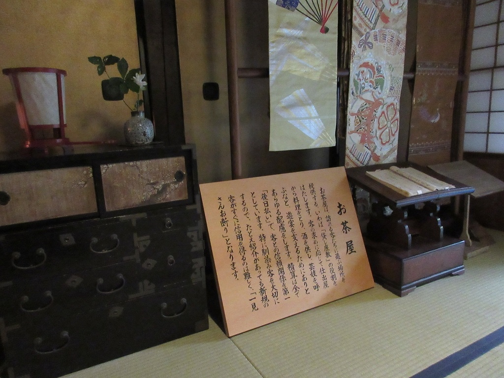 ひがし茶屋町の中でも代表的なお茶屋さんとして、大勢の来訪者を魅了しているのが、こちらの「志摩」です。荷物を一階のロッカーに預けて二階に上がると、華やかなお茶屋文化を感じる家具・調度品が並び、お座敷に展示されたお琴や琵琶が、今にも雅な音楽を奏で始めるのではと思えました。