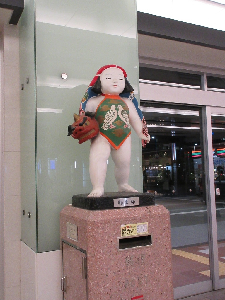 金沢駅の西口側、バスターミナルに抜ける手前に、一瞬不気味な金太郎人形があると思い、半ば怖い物見たさで近づいて見ると、ポストに乗った郵太郎人形という立派なお名前がありました。男児が獅子頭を持った「加賀人形」だとか。今のデザインであれば、イケメンかゆるキャラにするのでしょうが、60年以上前に作られたとのことで、こうした不気味で少し怖い顔であるのも頷けます。
