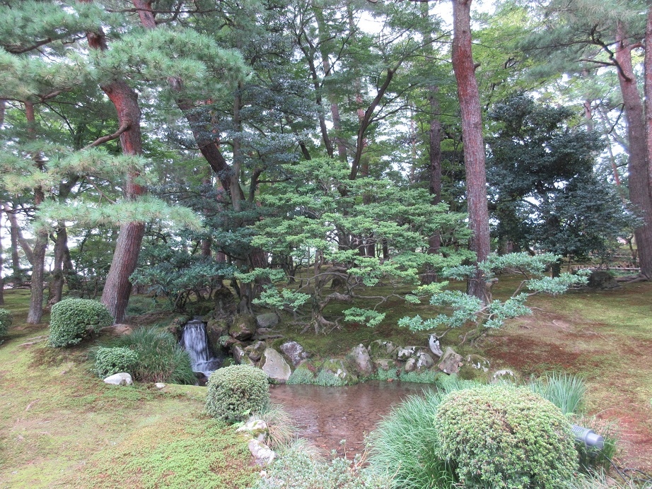 兼六園の桂坂口から入って右手に広がる桜ケ岡にある小さな滝で、散策している際に目に留まりました。本当に小さな瀧で、おそらく高低差1メートル程度だと思います。兼六園はいたるところに水がめぐっていて、思いがけない場所でせせらぎの音を聞くことが出来て、面白みを感じました。