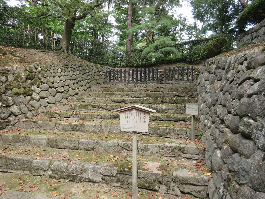 金沢の兼六園にある門の一つですが、こちらは今も使われておらず、苔むした石垣がかえって抒情的で魅力がありました。21世紀美術館あたりから広い幹線道路を上がっていく途中の左手にあり、馬も通ることが出来たといわれる幅の広い造りになっていました。もちろん建物は今はありませんが、説明書きがあるので当時の様子を想像することが容易でした。