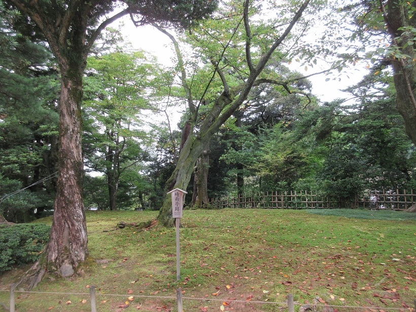兼六園内にある瓢池や蓮池門のある一角に、蓮池御殿跡(時雨亭跡)がありました。造園工事の際に、前田綱紀が指揮所となる蓮池御殿があったとされます。今は、緑の木立の中に小さな立て札が立てられていて、かろうじてそれと知ることができる程度です。足を止める観光客もほとんどいない場所で、観光スポットとしては魅力に欠ける感じがしました。