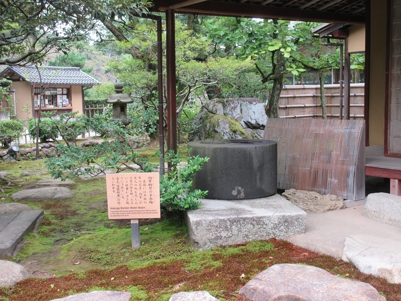 金沢の兼六園の中、瓢池近くに建つ茶室・夕顔亭の庭先に設置された二つの手水鉢のうちの一つがこちらです。円柱形をしていて表面は綺麗に磨かれていました。中国の琴の名手であった「伯牙」に関する故事が彫られてて、非常に芸術的な価値が高いもののように見受けられました。金沢の文化的な層の厚みを感じることができる一品でした。
