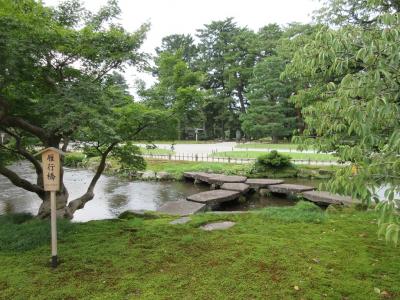 金沢の兼六園でも人気のスポットである霞ケ池の近くにある石橋が雁行橋です。団体の観光客の方も、この近くまで来てガイドさんの案内を聞いていました。赤室戸石を使っており、雁が飛んでいるように見えることから、この名前がついています。渡ることができないのですが、その分写真は写しやすかったですね。確かに石を並べた様は、雁が飛んでいるようにも見えなくもない・・・。
