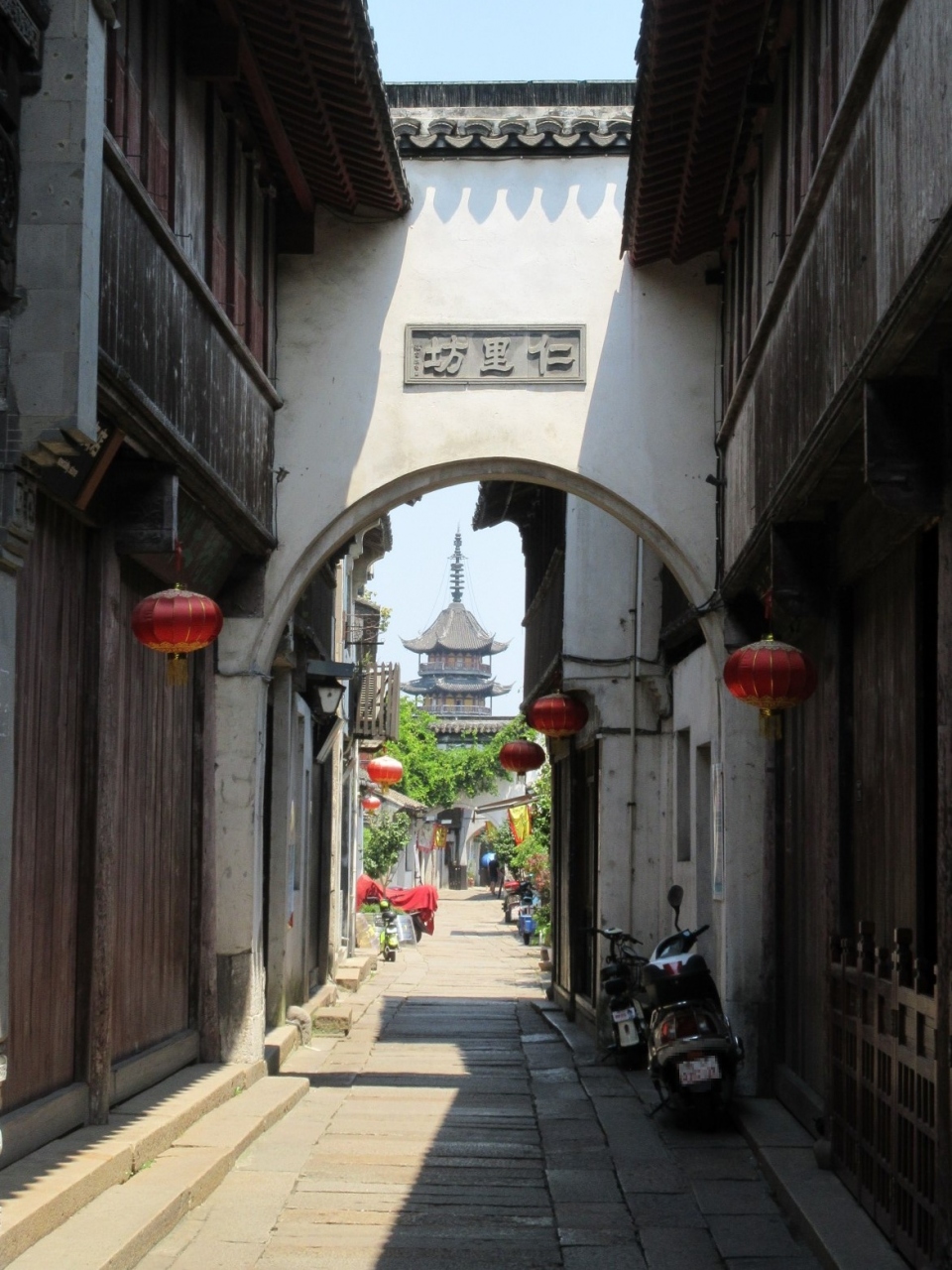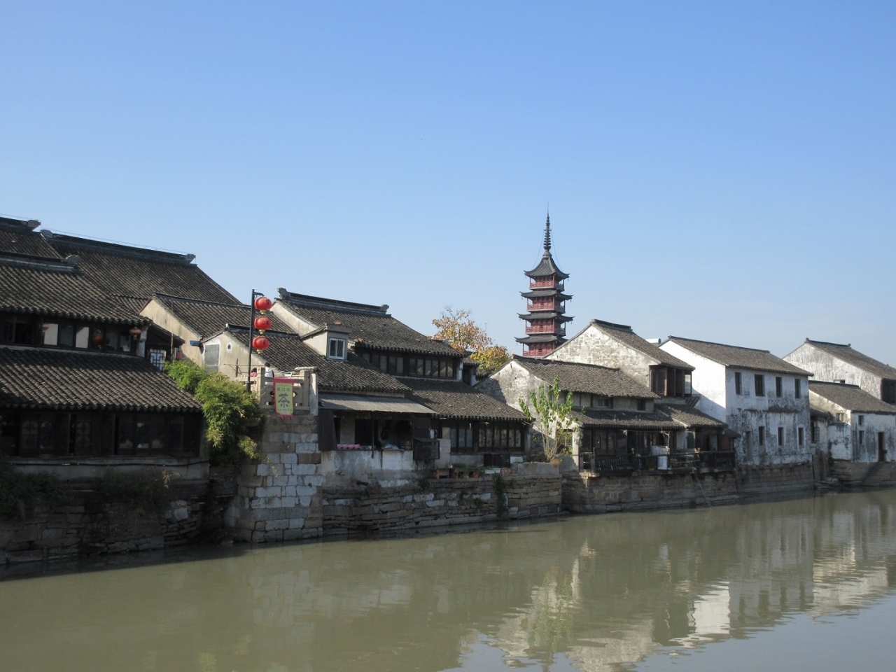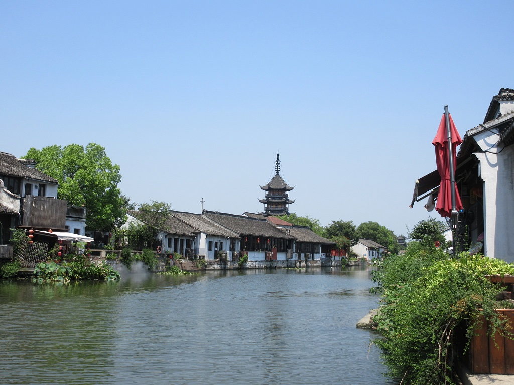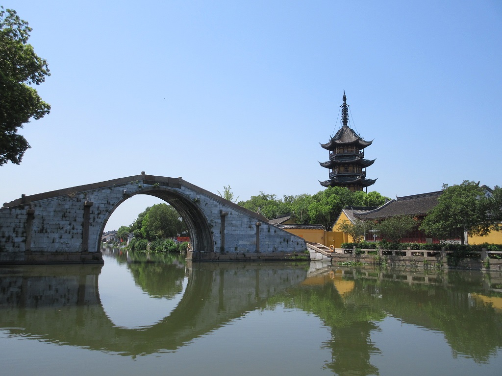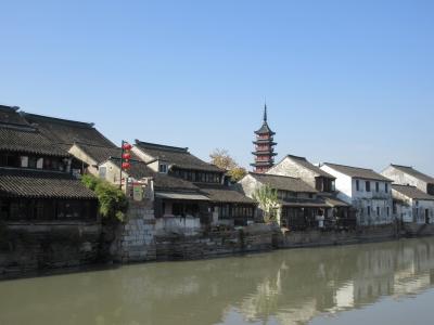 蘇州のはずれに幾つかある水郷村の一つといって良いでしょう。蘇州駅を起点にして午前中の日帰り旅行として訪れました。蘇州駅から地下鉄4号線に45分ほど乗り松陵大道駅まで行き(6元)、1aの出口を出て川を渡ったすぐ南側にあるバス停に向かいます。そこから「呉江震澤専線」と書かれたバスに乗車すること40分、終点の震澤汽車站で下車(5元)。すぐ東南に見えるコンクリートの橋を徒歩で渡り、右手に牌楼が見えるので右折。ここまで徒歩で7,8分。右手にツーリストインフォメーションがあるので、簡単なパンフを頂き、散策を開始しました。非常にシンプルな古鎮で、石畳の道をさらに5、6分歩くと、水辺に静かに佇む慈雲寺の仏塔が目に飛び込んできました。高さ38mほどの5層の塔は、丁度法隆寺の五重塔と同じ位の高さで、主張しすぎることなく落ち着いた景観を形作っていました。石橋を慈雲寺のある方に渡ると、宝塔路という通りがほぼ東西に延びていて、何軒かの飲食店が営業していました。観光に1時間から1時間半ほど、食事に30分をあててショートトリップを組んで訪れるのに丁度良い古鎮でした。