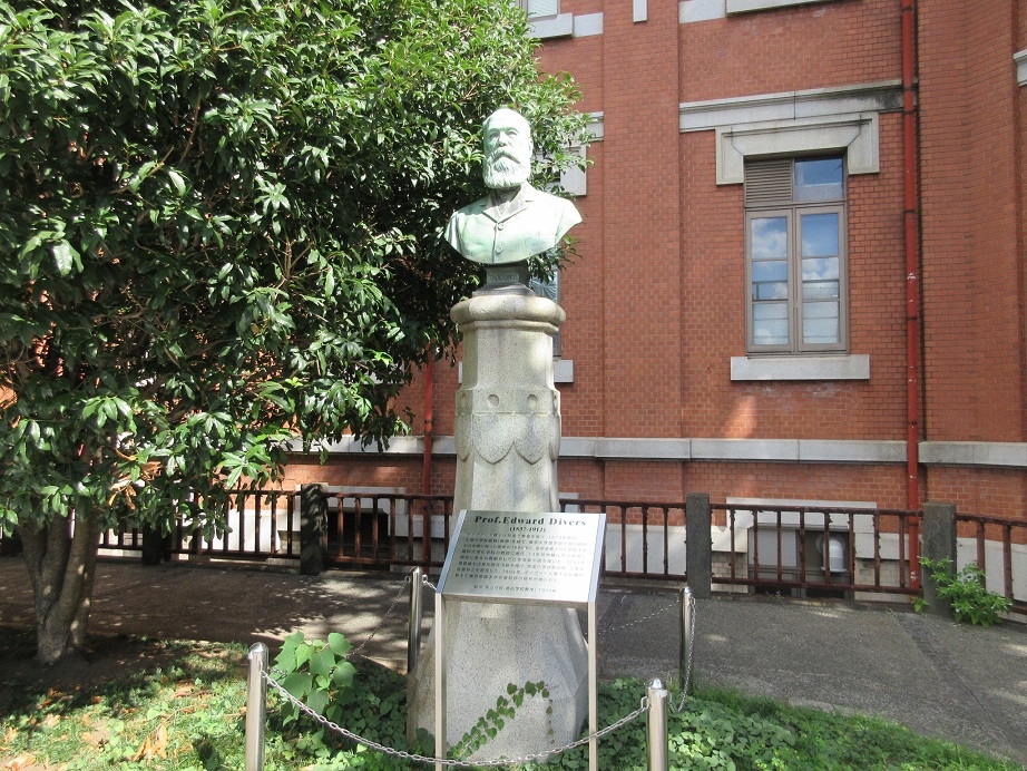 髭が立派だったので伊藤博文と思ったのですが、近づいてみると 「エドワード・ダイヴァース」の像と説明がありました。英国出身の化学者で、東京大学理学部の前身とされる帝国理科大で教鞭をとられた方とのこと。勉強になりました。
