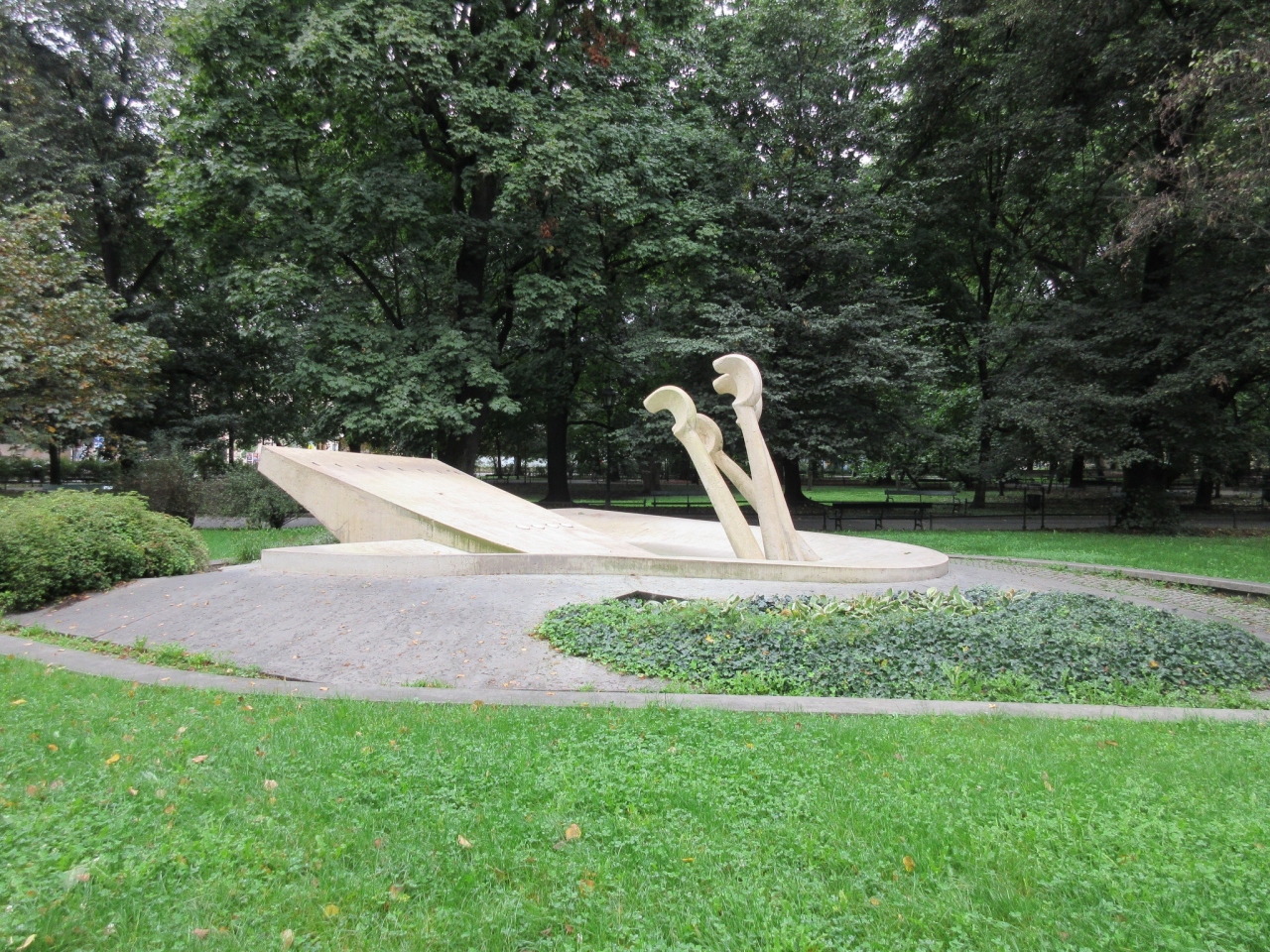 クラクフ旧市街の散策中に、【大学公園】を聖フランシスコ教会方面いに歩いていた際に見つけた金色のモニュメントがこちらで、ショパンのピアノの鍵盤が音を出す様子を彷彿とさせるようなデザインになっていました。雲な多く肌寒い時で、足を止めて見学している人はほとんどいませんでした。