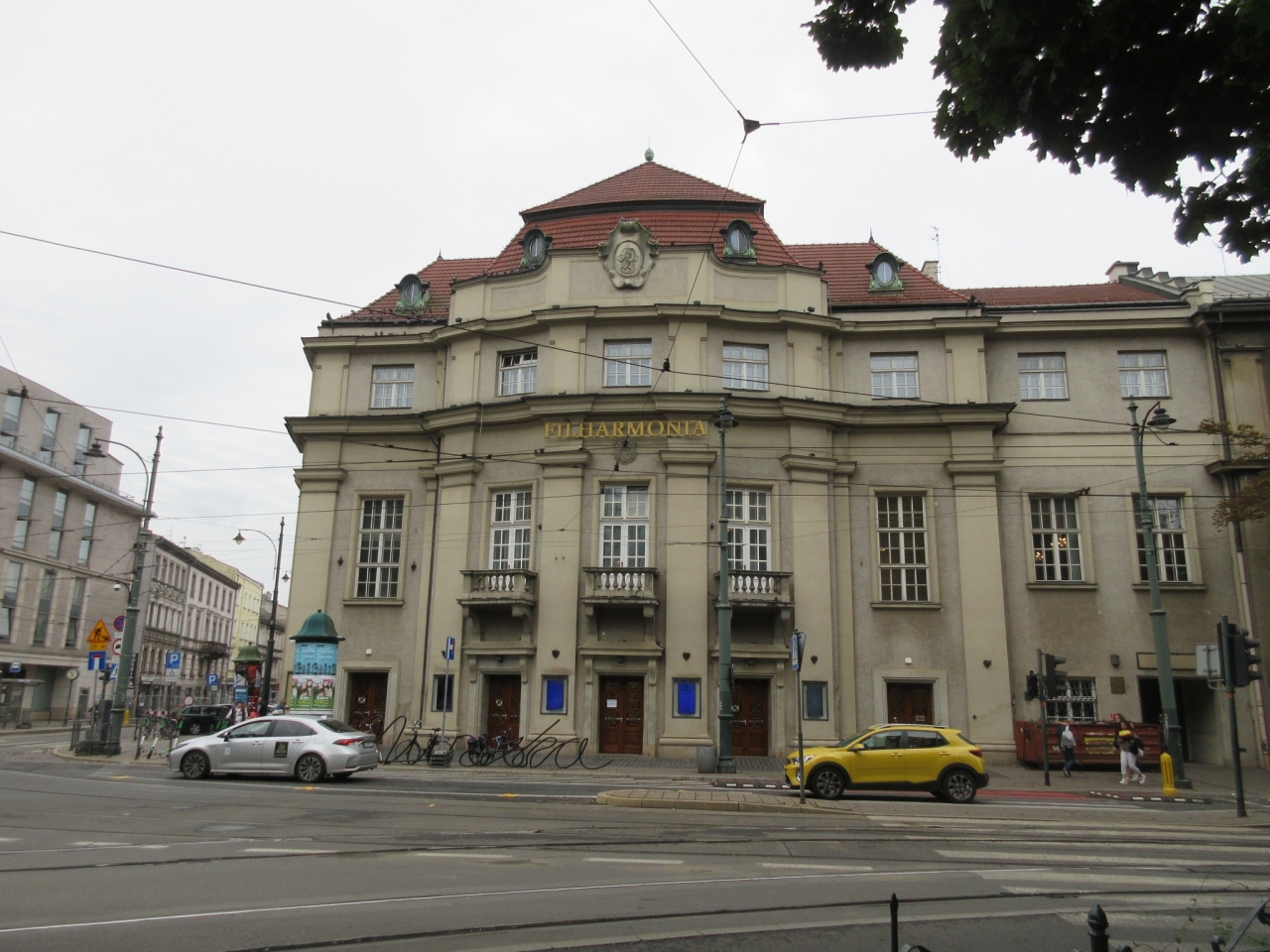 クラクフ旧市街の西側にある大学公園を南に向かって散策し、ショパンの金色のモニュメントのあるところから西に方向をかえて大通りを渡ったところに、堂々としたたたずまいの劇場があり立ち寄りました。薄い黄色の外壁で、また劇場としては比較的小ぶりな建物でした。正面エントランス前に、おそらく筆記体で書いたFILHARMONIAと思しき文字のモニュメントが置かれていました。