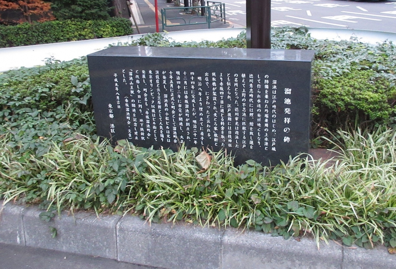東京に滞在した際、溜池山王から赤坂界隈を散策しました。その際に、地下鉄溜池山王駅で下車して六本木通り側の交差点の一角に、こちらの石碑を見つけました。黒の石材に白色の文字で、非常に読みやすい石碑でした。以前からなぜ「溜池」という名前がついているのかと思っていましたが、説明を読むと江戸時代に江戸城の防備もあって大きな溜池があったことから、この地名がついたのだとか。もちろん今ではそのような溜池は見当たらず、近代的なビルに囲まれた都会の風景、そしてその名前を冠した地下鉄駅が残るのみでした。