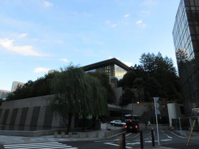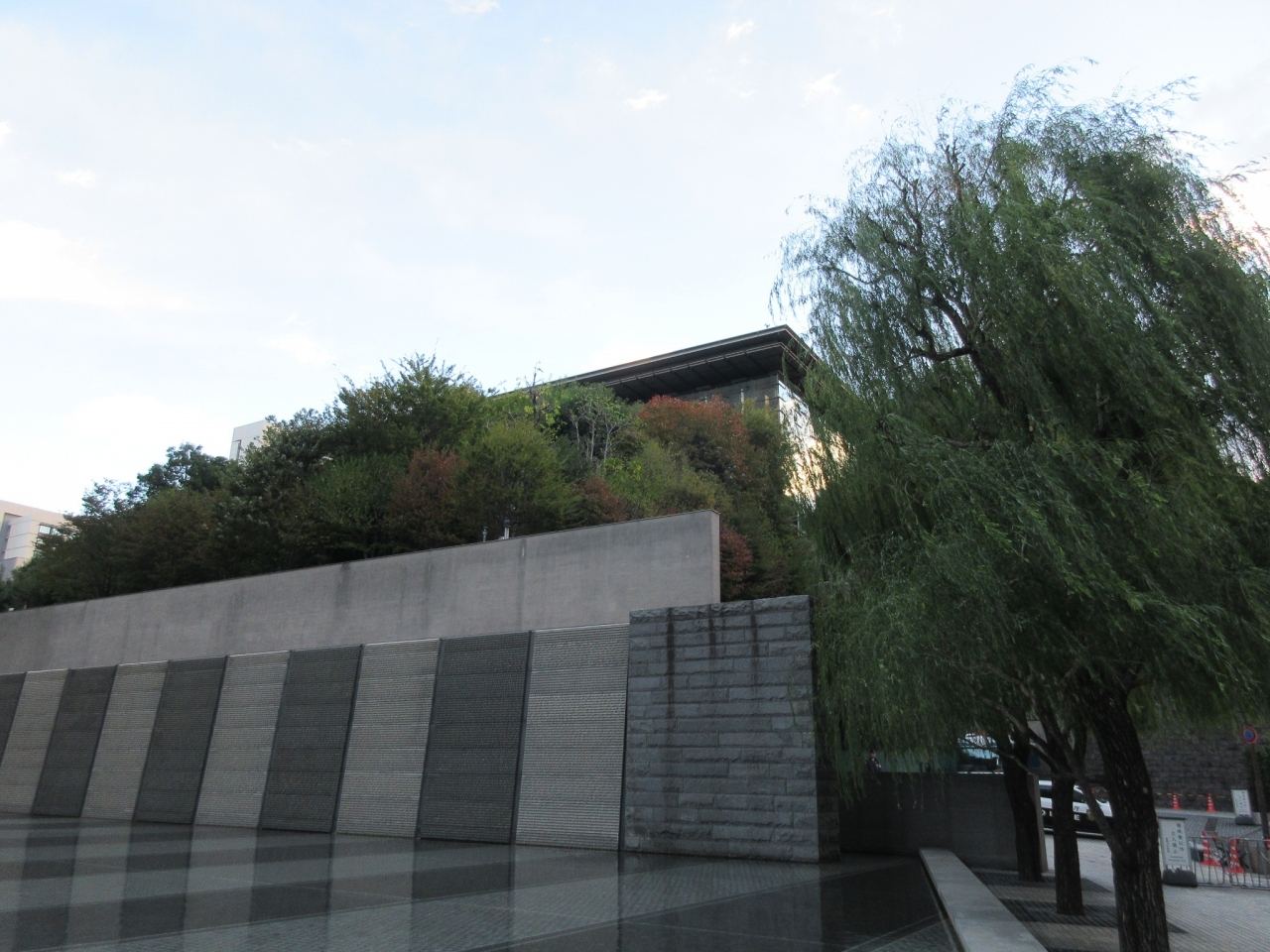コンクリートの擁壁と緑の木々の奥に、ガラス張りの近代的な建物がすこしだけその姿を覗かせていました。