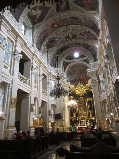 旧市街の南端にある【ヴァヴェル城】から東南歩行に伸びる大通り沿いにあるこちらの【Church of Conversion of Paul】を見学しました。建物の外観はどこかくすんだ色で、地味が佇まいだったのですが、トラムの走る大通りを注意して渡って石段を上がって内部に入ると、バロック様式の豪華な装飾が施されていました。天井一杯にキリストや聖人の姿が描かれており、所々にだまし絵もあって興味をそそられました。