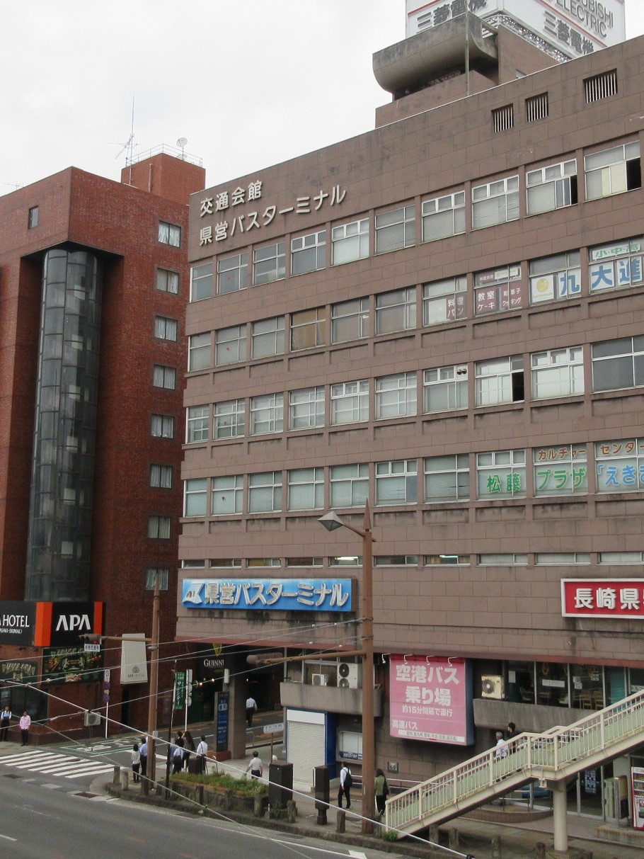 長崎空港へのバスの乗り場がここのバスターミナルにあります。それ以外にも長崎県内各所へ向かうバスがひっきりなしに発着していました。場所は長崎駅のすぐ向かい、歩道橋を渡った向いにある昭和の雰囲気が色濃く残る古めかしいビルの中です。