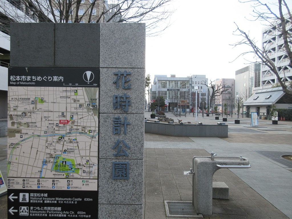 JR松本駅や松本パルコからほど近い場所にある、広めの市内公園です。花いっぱい運動が松本から始まったと聞いたころがありますし、そうした関係からなのか「花時計公園」とも呼ばれています。ただ、丁度私が訪問した日は天気こそ良かったものの、とても寒い日だったので、公園でくつろぐ人もおらず少し寂しい位でした。