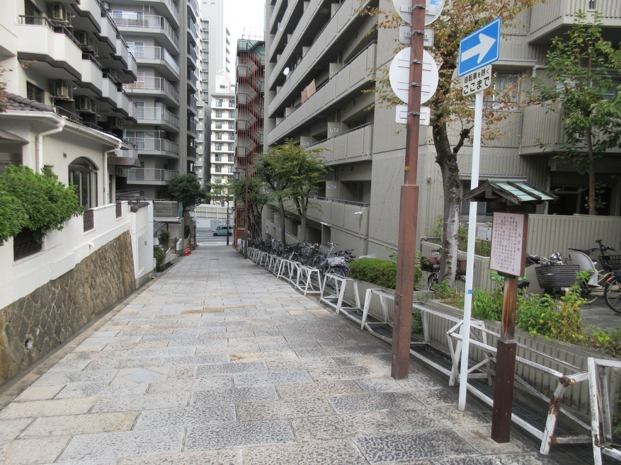 【藤次寺】や【生國魂神社】界隈を散策した際、千日前通りから【生國魂神社】の北側入口への上がって来た急坂がこちらの【真言坂】です。両方にマンションに挟まれた細い通りで、石畳が敷かれていました。長さはさほどではないですが、運動不足の身には結構応えました。坂を上がりきると説明板が設置されていて、それによると、この界隈には多くの真言宗の寺院があったとのこと。