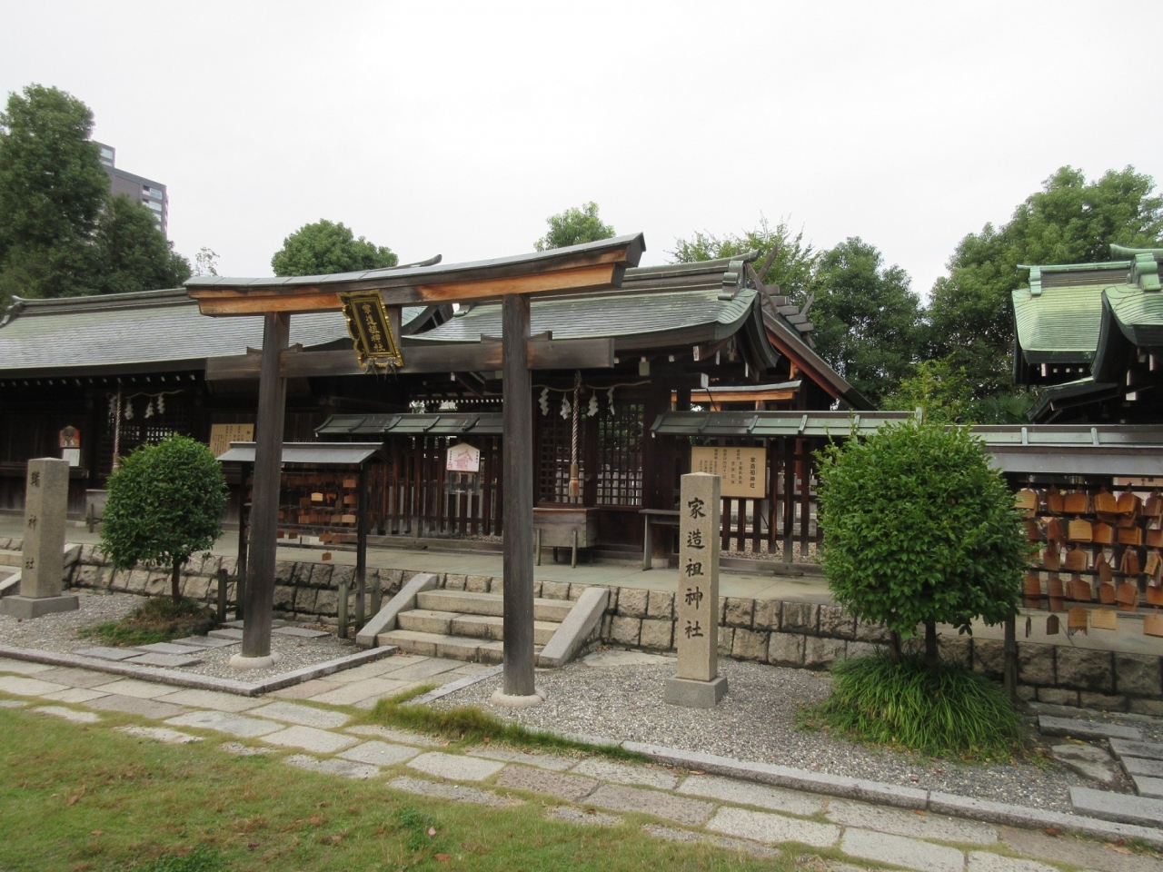 【生國魂神社】の境内にある摂社・末社のひとつがこちらで、鞴神社の隣にあり神社らしい風格を感じさせる造りになっていました。【家造祖神社】という名前を見ると「家を造営する」仕事、つまり建築の神様を祀っていることがすぐに分かりました。奥にある本殿は伊勢神宮のような妻入りの構造のように見え、この神社を特徴付けていました。