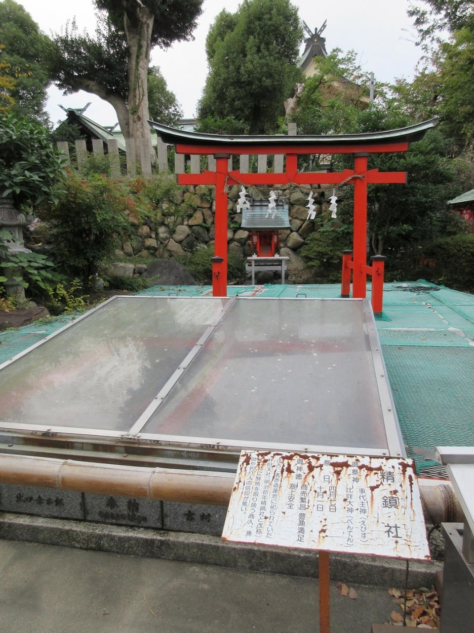 北側の冠木門をくぐって【生國魂神社】に入り、広い境内にある摂社・末社一つがこちらの神社で、豊漁のご利益がありそうで、漁業に関係する方にかかわりが深いようです。朱塗りの鳥居の手前にガラスが埋め込まれていて良く見てみると、なんとガラスの下には池になっていました。お供えはこの池を泳ぐ魚でしょうか・・・。他では見かけない構造の神社であり、非常に興味深く感じられました。
