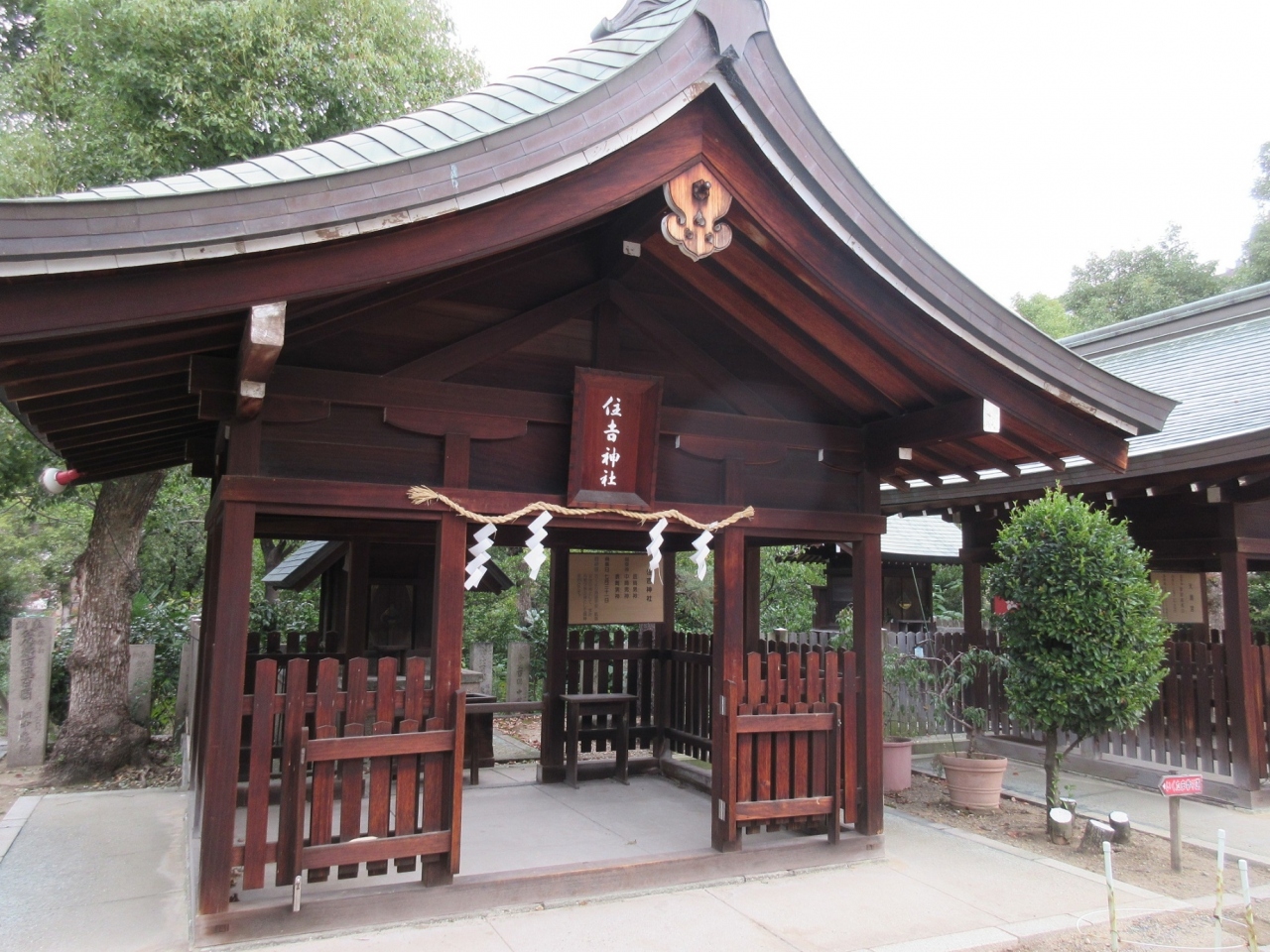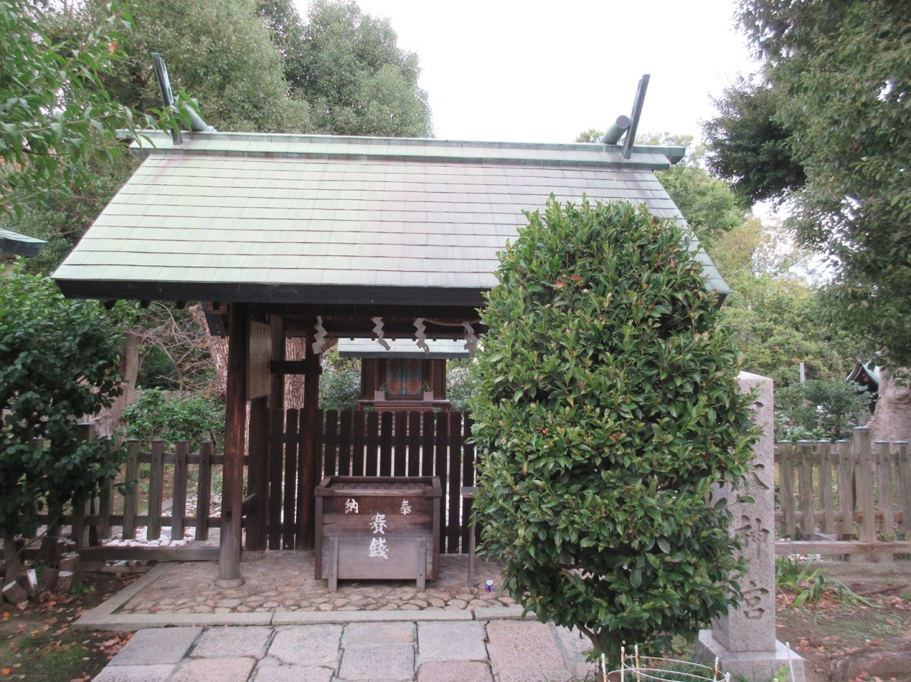 【生國魂神社】の境内を散策した際に目に留まった摂社や末社の中の一つがこちらで、伊勢神宮の皇大神宮の分霊を祀っているとのことで、小さいながらも青銅葺きの屋根があり、木製の柵で囲まれた境内は握りこぶし程の石を敷き詰めてありました。その奥の小さな本殿は参拝所から見ることが出来ました。