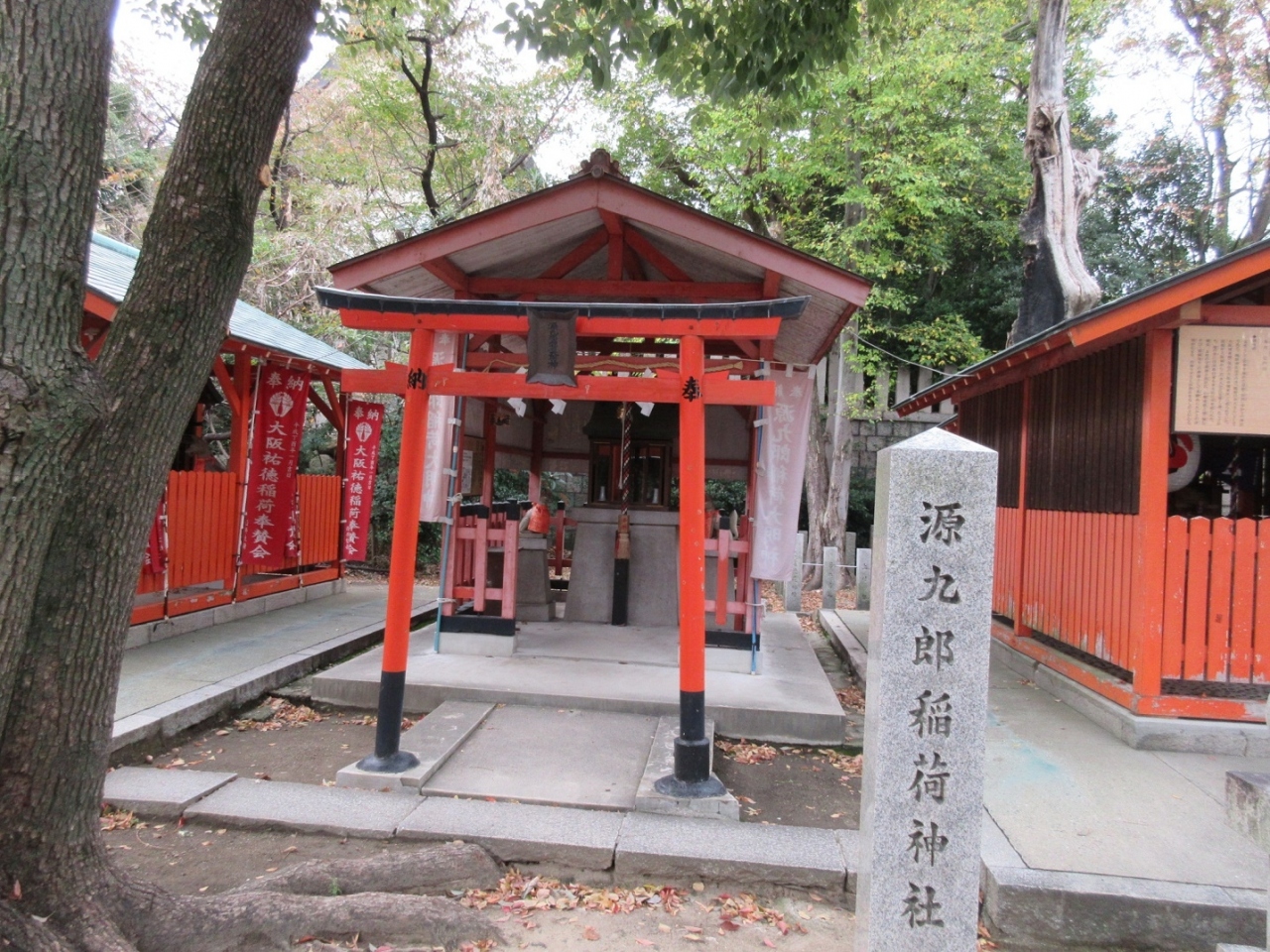 【生國魂神社】の広い境内の中にある摂社・末社の一つがこちらで、奈良県大和郡山市に勧進帳に出てくる源九郎義経狐を祀る【源九郎稲荷神社】がありますが、そこから分祀されています。細い木の朱色の鳥居はどこのなく儚げに思えましたし、奥の社殿も大風が吹けば飛んでしまうような簡単な造りでした。