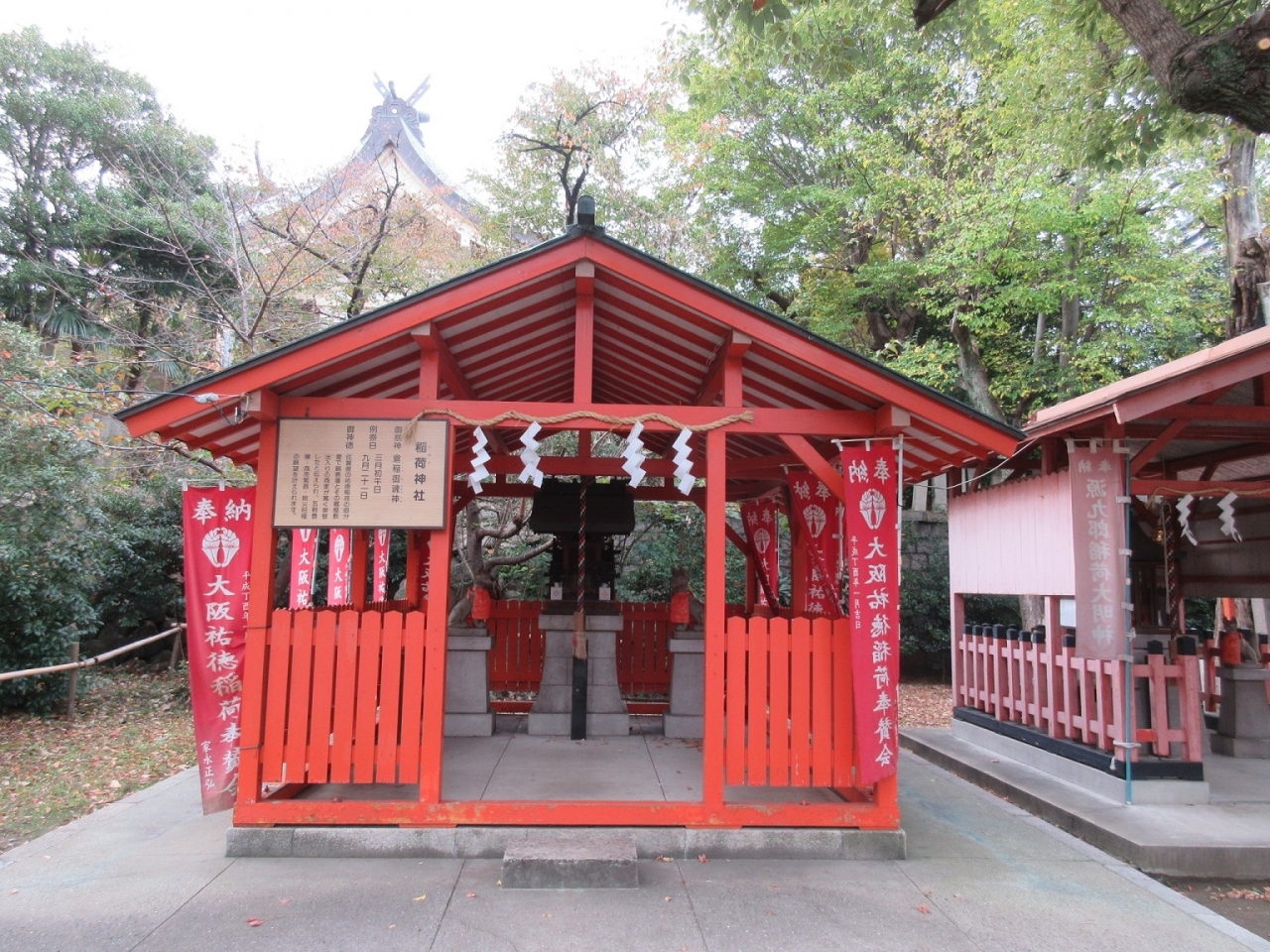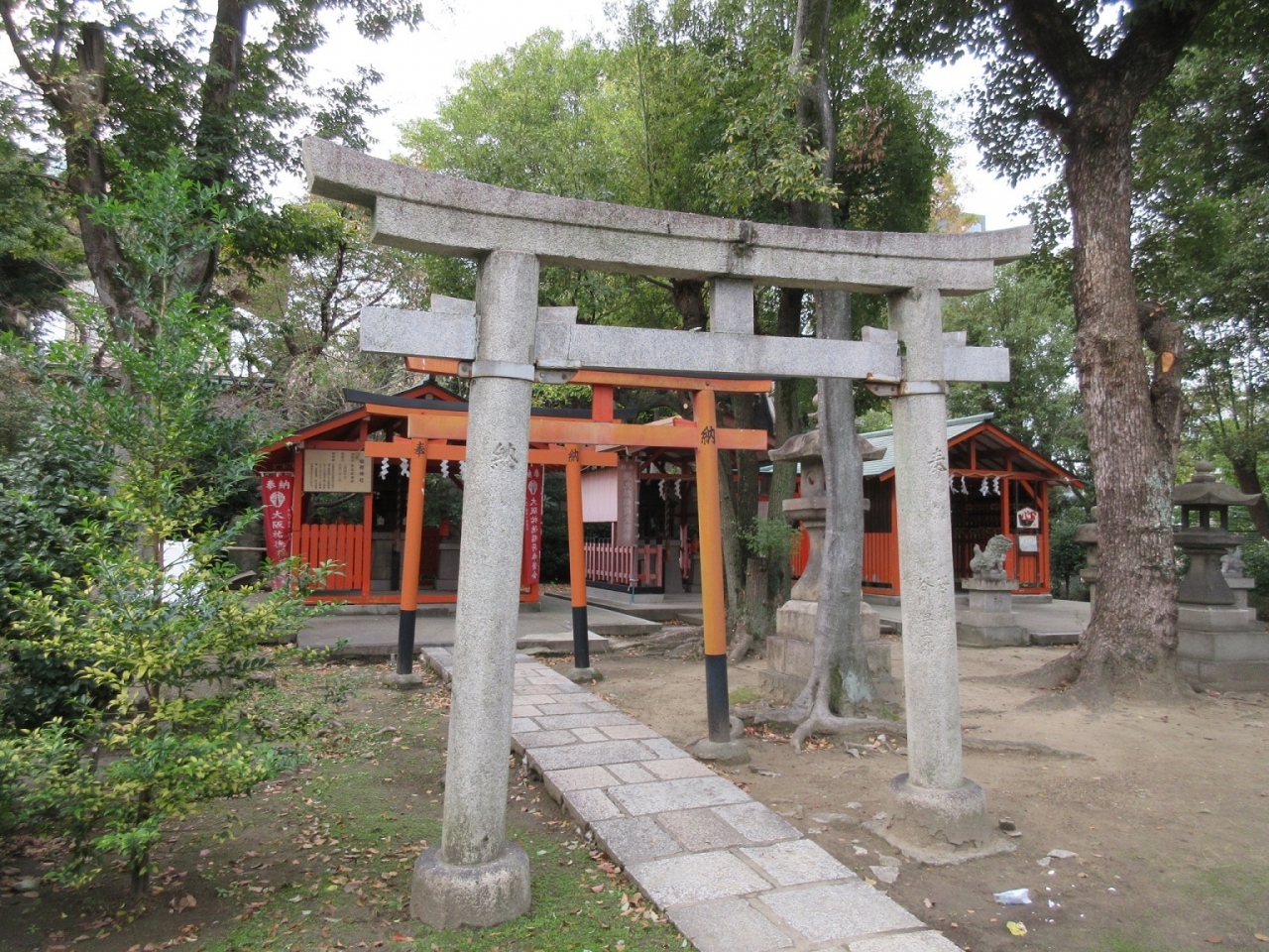 【生國魂】神社の境内にある摂社・末社の一つがこちらで、鳥居が三連で連なる様は見ごたえがありました。奥の社殿の建物自体は、同じような形の神社も並んでいて代り映えしないのですが、そうした中ではこちらが石の参道もあって一番見ごたえがありました。祠の左右には小さな狐像が鎮座しており、稲荷神社らしい雰囲気が十分でした。