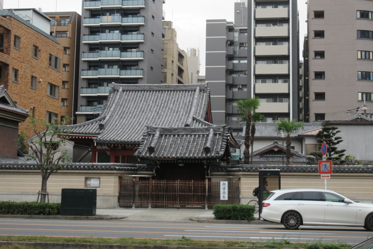 大阪谷町界隈の寺町を散策した際、【生國魂神社】からほど近い、谷町筋沿いにあるこちらの寺院にも立ち寄りました。門扉がしっかりと閉められており、境内には足を踏み入れる事が出来ず、黄色の塀の外側から眺めることしかできませんでしたが、立派な山門の奥にある昔ながらの寺院建築の本堂が見えており、均整のとれた大屋根と棟、灰色の甍が特徴的でした。また、山門には「無量寿灸」と大きな白生に黒文字で書かれた案内看板があり、そうした施術で有名なお寺だと分かりました。