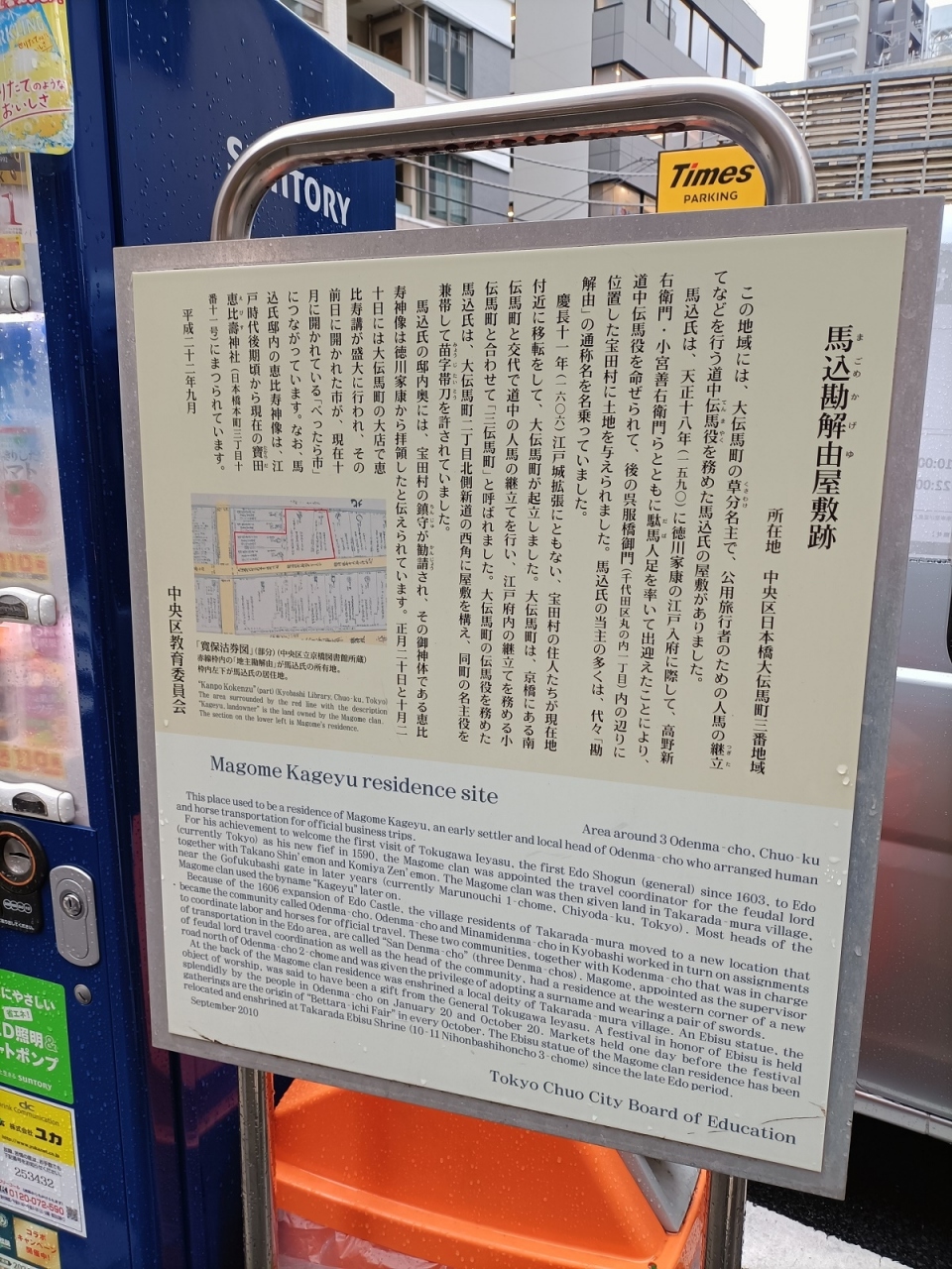 屋敷の跡とのことですが、今に残るは時間ぎめの駐車場と自動販売機、そしてこの説明板のみ。江戸の風情が微塵も感じられないスポットでした。