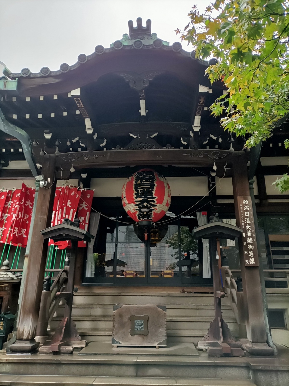 本堂には「大黒天」と書かれた赤い幟旗もあったり、日蓮大菩薩と書かれた赤い提灯が下がって居たりと、他のお寺と違いが大きく戸惑いました。